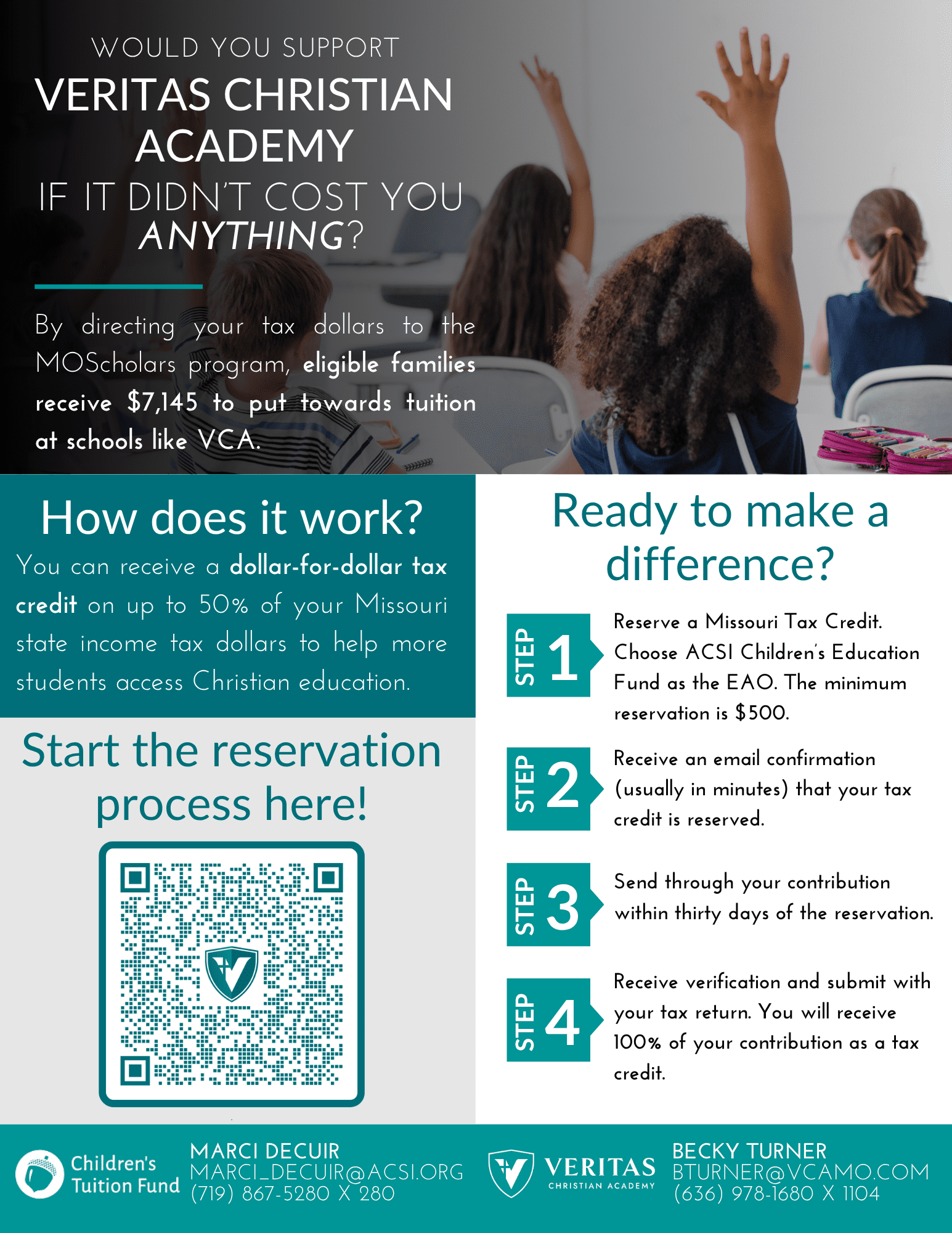 Did you know you can send up to 50% of your Missouri income tax dollars to support VCA without costing you anything? Individuals and corporations who pay Missouri income tax can receive a 100% tax credit on up to half of their state tax obligation to help qualified students access VCA. Click here to learn more about MOScholars. Ready to contribute? Click here to sign up through the Children’s Tuition Fund.